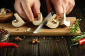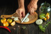 Szef kroi cebulę nożem na desce do robienia zupy na lunch. Pomysł z dietą roślinną. Środowisko pracy na stole kuchennym