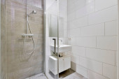 Przegroda szklana między kranem prysznicowym a toaletą ścienną w nowoczesnej toalecie w domu
