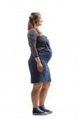 Portret ciężarnej kobiety w niebieskiej bluzce i żółte legginsy odizolowane na białym tle