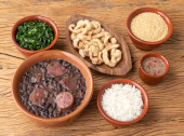 Tradycyjna brazylijska feijoada w misce nad drewnianym stołem.