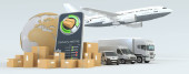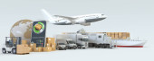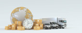 3D renderowanie mapy świata, stos paczek i wózek widłowy, van, ciężarówka pociąg i samolot