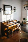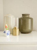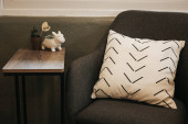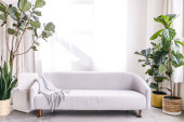 wnętrze nowoczesnego salonu z wazonem, kwiatem i zegarem