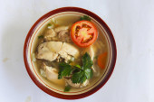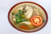 Zupa z kurczaka podawana z warzywami, pomidorami, selerem w misce, łyżeczką i widelcem. z czarnym tłem