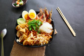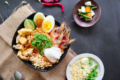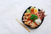 laksa, laksa curry wykonane z vermicelli, makaron, kiełki fasoli, jajko, wapno tofu i krewetki z pikantnym sosem zupy, który jest bogaty w przyprawy. laksa serwowane na misce, izolowane na białym tle.