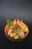 laksa, laksa curry wykonane z vermicelli, makaron, kiełki fasoli, jajko, wapno tofu i krewetki z pikantnym sosem zupy, który jest bogaty w przyprawy. laksa serwowane na misce, izolowane na białym tle.