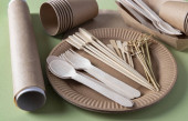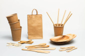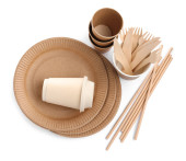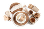 Zestaw jednorazowych zastaw stołowych na białym tle, widok z góry