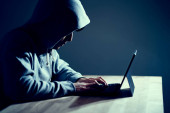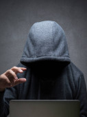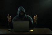 haker stres w czarnej bluzie robi obie ręce na głowie jest hacking nie powiodło się, istnieją urządzenia, takie jak pistolet, karta kredytowa i laptop na stole odizolowany na ciemnym tle
