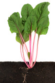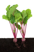 Rośliny buraczane z kulkami i liśćmi korzenia ziemi. Zdrowa super żywność zrównoważone świeże lokalne produkują wysoką zawartość przeciwutleniaczy, antocyjanów, błonnika, witamin i minerałów. Na białym.