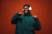 Zdjęcie "Czarny Włoch tańczy podczas słuchania muzyki ze słuchawkami odizolowanymi nad brązową ścianą" może być wykorzystywane do celów osobistych i komercyjnych zgodnie z warunkami zakupionej licencji Royalty-free. Obraz jest dostępny do pobrania w jakości wysokiej rozdzielczości do 5760x3840.