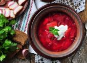 Tradycyjny ukraiński barszcz z zieloną cebulą i śmietaną. Pyszna zupa buraczana w misce z chlebem żytnim
