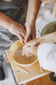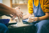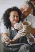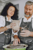 Zdjęcie "Wzajemna praca twórcza. Dorosła elegancka para w luźnych ubraniach i fartuchach. Ludzie tworzący miskę na kole garncarskim w glinianym studio." może być wykorzystywane do celów osobistych i komercyjnych zgodnie z warunkami zakupionej licencji Royalty-free. Obraz jest dostępny do pobrania w jakości wysokiej rozdzielczości do 5760x3840.