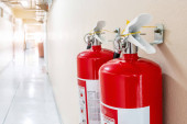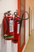 Gaśnica i system pomp gazowych na ścianie. Potężny sprzęt gaśniczy. Ognioodporny. Odporność ogniowa.