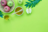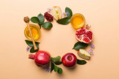 Płaska kompozycja świecka z symbolami Żyd Rosz Haszana wakacje atrybuty na kolorowe tło, koncepcja Rosz Haszana. Nowy Rok wakacje Tradycyjne. Widok z góry z miejsca kopiowania.