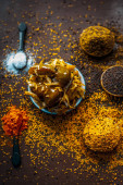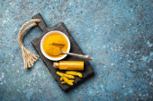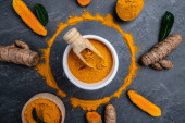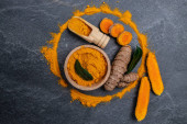 Zdjęcie "kurkuma lub korzeń kurkuminy. Kurkuma w proszku i świeża kurkuma. na konkretnym tle. Przyprawa, naturalne zabarwienie, medycyna alternatywna. Długi sztandar. widok z góry." może być wykorzystywane do celów osobistych i komercyjnych zgodnie z warunkami zakupionej licencji Royalty-free. Obraz jest dostępny do pobrania w jakości wysokiej rozdzielczości do 5760x3840.