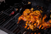 Zdjęcie "Kurczak tabaka marynowany z papryką jest grillowany z warzywami. Ogień widać spod rusztu. W pobliżu znajduje się pół pomidora, zielonej cebuli, bakłażan, papryka." może być wykorzystywane do celów osobistych i komercyjnych zgodnie z warunkami zakupionej licencji Royalty-free. Obraz jest dostępny do pobrania w jakości wysokiej rozdzielczości do 5760x3840.