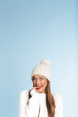 Biała dziewczyna w kapeluszu uśmiecha się i patrzy na aparat odizolowany na niebieskim tle