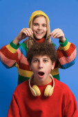 Zdjęcie "Biała dziewczyna i chłopak śmieją się podczas zabawy razem izolowane na niebieskim tle" może być wykorzystywane do celów osobistych i komercyjnych zgodnie z warunkami zakupionej licencji Royalty-free. Obraz jest dostępny do pobrania w jakości wysokiej rozdzielczości do 5760x3840.