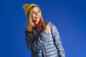 Biała dziewczyna w kurtce uśmiecha się i patrząc na bok odizolowany na niebieskim tle