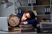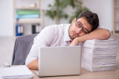 Młody pracownik biznesowy niezadowolony z nadmiernej pracy w biurze