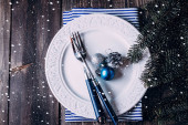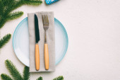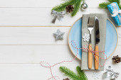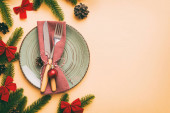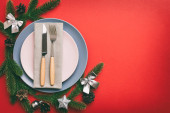 Stolik świąteczny nakrycie świątecznym wystrojem i talerze, kine, widelec i łyżka. Świąteczne tło. Widok z góry z miejsca kopiowania.