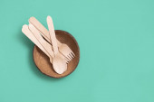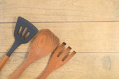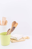 Drewniane łyżki i widelce w szklanym wazonie z białym tłem ściennym