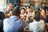 Zdjęcie "Grupa wesołych wielorasowych przyjaciół patrzących na siebie i brzęczących kieliszkami do wina z czerwonym winem podczas obchodów wspólnie przy stole z jedzeniem w restauracji" może być wykorzystywane do celów osobistych i komercyjnych zgodnie z warunkami zakupionej licencji Royalty-free. Obraz jest dostępny do pobrania w jakości wysokiej rozdzielczości do 5760x3840.