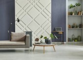 Szary pokój dekoracyjny tło ściany, ciemnoniebieska sofa, środkowy stół, koc w stylu poduszki, wazon z bawełny kwiat i dywan, pomarańczowa lampa, dekoracja wnętrz.