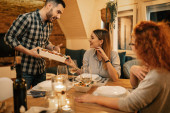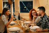 Small group of young happy adults having fun while eating dinner at dining table at home.