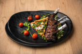 stek filetowy z pomidorem podawany w naczyniu izolowanym na ciemnym tle widok żywności