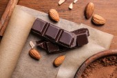 Kawałki smacznej czekolady z orzechami laskowymi i migdałami na drewnianym stole, zbliżenie