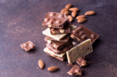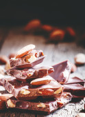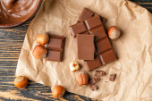 Kawałki smacznej czekolady mlecznej z orzechami laskowymi na drewnianym stole, zbliżenie