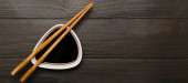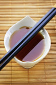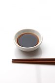 Miska sosu sojowego i pałeczki na białym tle