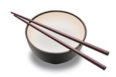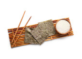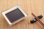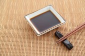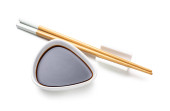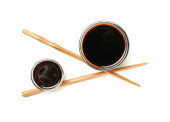 Miska sosu sojowego, pałeczki i worek tkaniny na białym tle