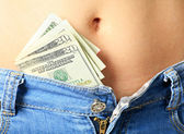 ręka, wyciągając dolarów pieniędzy z kieszeni jeansów