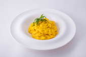 Makaron z różnymi rodzajami sera i pietruszki w talerzu na białym tle