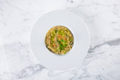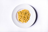 Makaron z pesto, ser, pietruszka i bazylia w talerzu na białym tle