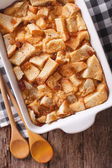 Piekarnik pieczony doskonały deser Peach Cobbler na betonowym szarym tle. Poziomy widok z góry z góry