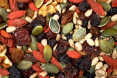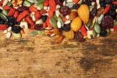 wymieszać nasiona orzechy i suszone owoce, na drewnianym stołem