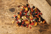 wymieszać nasiona orzechy i suszone owoce, na drewnianym stołem