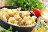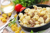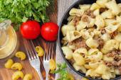 Makaron z ragout Bolognese na drewnianym stołem