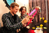 Smiling fashionable rich attractive couple sitting on sofa at ho