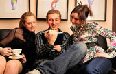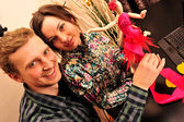 Smiling fashionable rich attractive couple sitting on sofa at ho