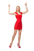Kobieta wciskając wirtualny przycisk izolowany na białym