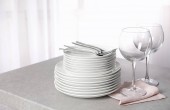 Różne czyste naczynia, sztućce i szklanki na białym marmurowym stole w kuchni