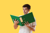 Zdjęcie "Przystojny człowiek czyta książkę na zielonym tle z miejscem na tekst" może być wykorzystywane do celów osobistych i komercyjnych zgodnie z warunkami zakupionej licencji Royalty-free. Obraz jest dostępny do pobrania w jakości wysokiej rozdzielczości do 5760x3840.