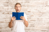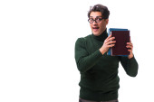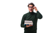 Przystojny człowiek czyta książkę na zielonym tle z miejscem na tekst