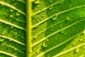 Makro zbliżenie Piękny świeży zielony liść z kroplą wody w słońcu rano natura tło.
