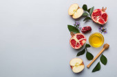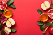 Płaska kompozycja świecka z symbolami Żyd Rosz Haszana wakacje atrybuty na kolorowe tło, koncepcja Rosz Haszana. Nowy Rok wakacje Tradycyjne. Widok z góry z miejsca kopiowania.
