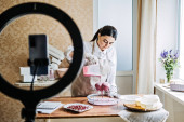 Zdjęcie "Kobieta piekarz, cukiernik przygotowuje zamówienie ciasta. Arabska Azjatka robi ciasto na sprzedaż online. Kobieta małe firmy piekarnia właściciel przygotowuje zamówienie dla klienta." może być wykorzystywane do celów osobistych i komercyjnych zgodnie z warunkami zakupionej licencji Royalty-free. Obraz jest dostępny do pobrania w jakości wysokiej rozdzielczości do 5760x3840.