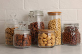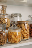 Pojemniki szklane z różnymi płatkami śniadaniowymi na półce